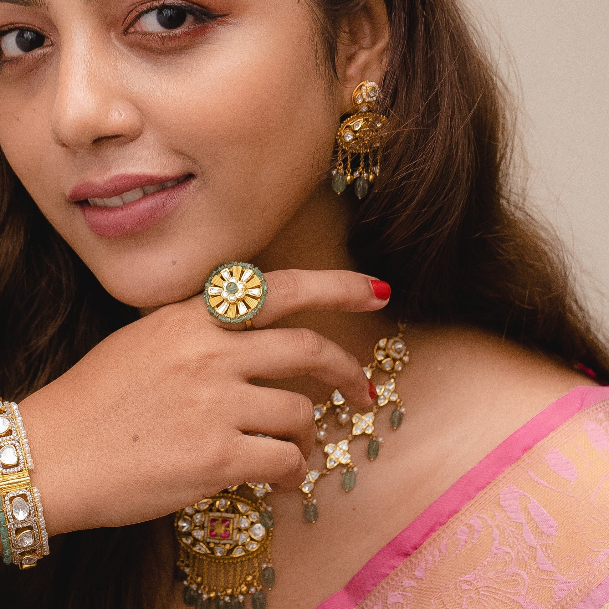 AN 22K GOLD ANTIQUE RING STUDDED WITH MOZONITE STONE, AND FINE EMERALD MOTI...