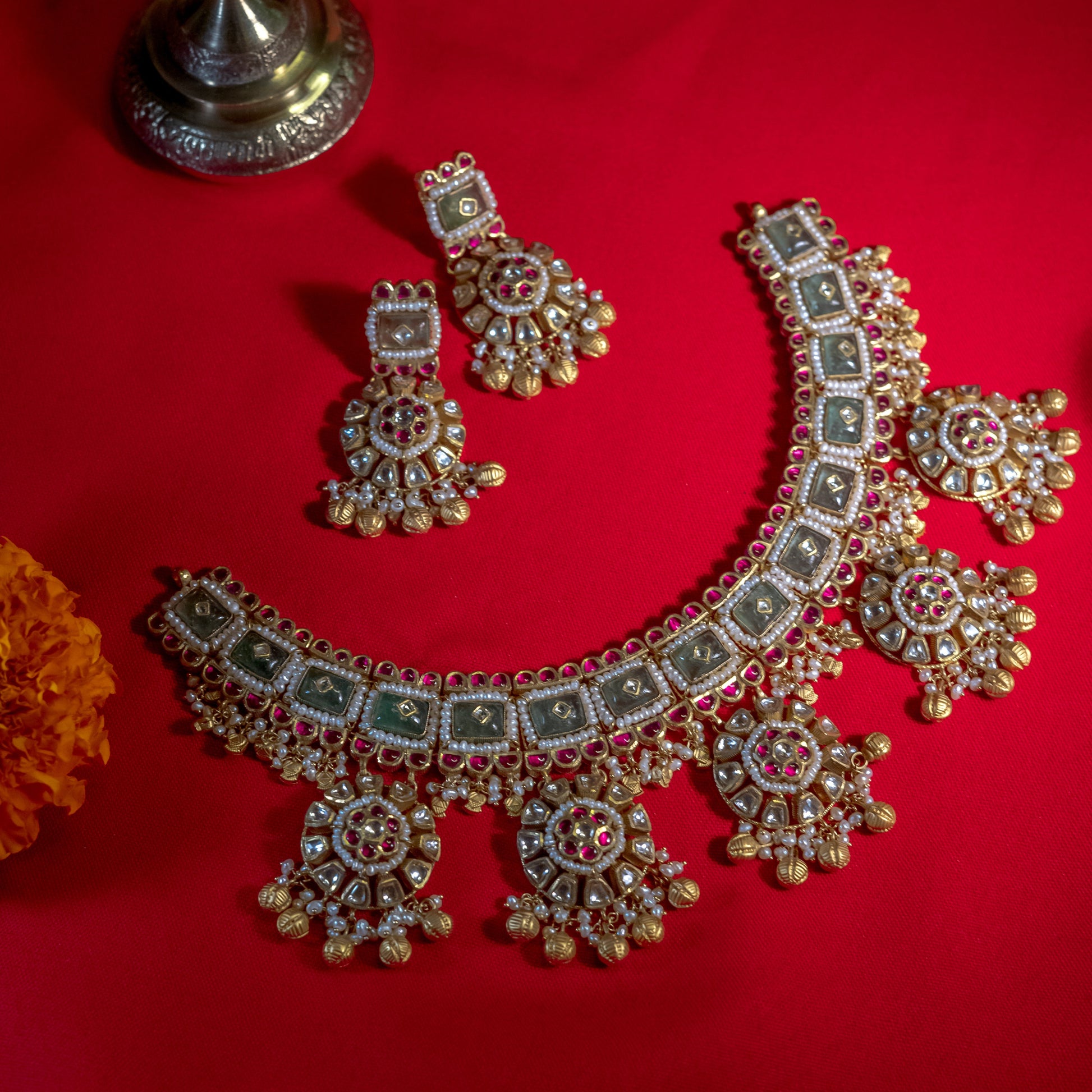 An Antique 22Karat Gold antique necklace with royal craftmanship ,with jadau russian emeralds stone studded with pure cold carving ,adorned with kundan,mozonite stones,nakshi gold balls and khaka moti for timeless elegance.