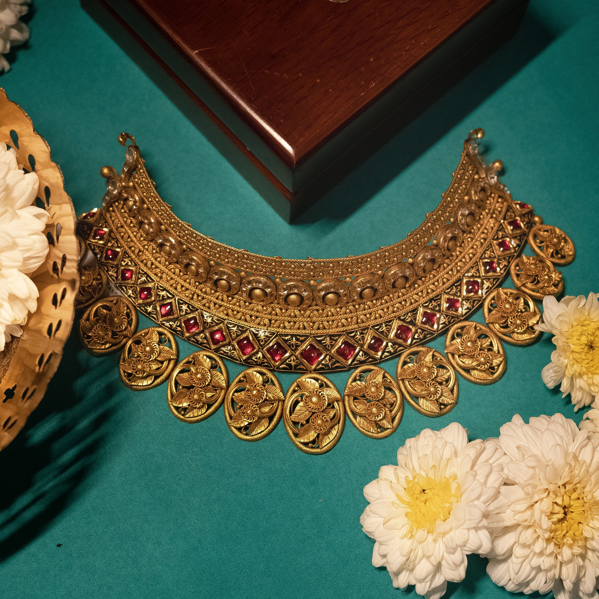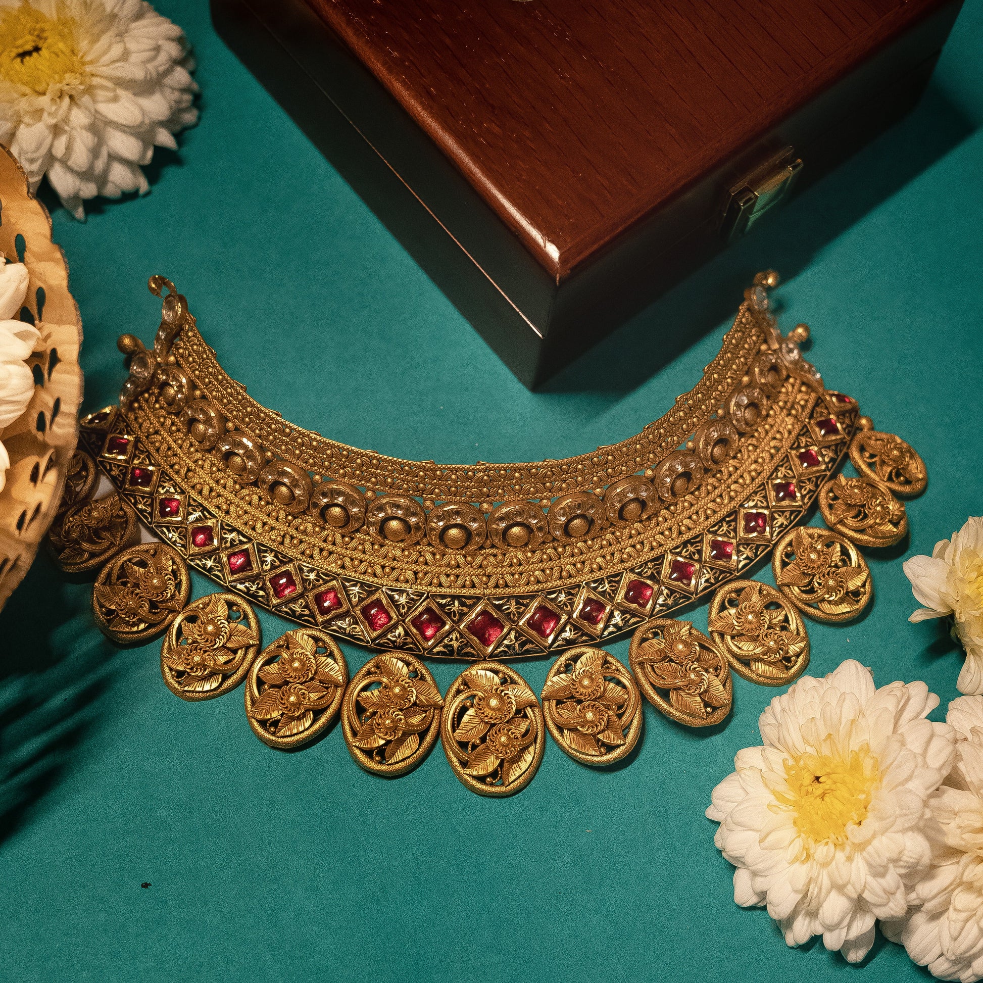 Exquisite 22K gold chokar, adorned with dazzling mozonite stones, intricate hand-carved nakshi detailing, and regal gold flower motifs for a truly timeless luxury.