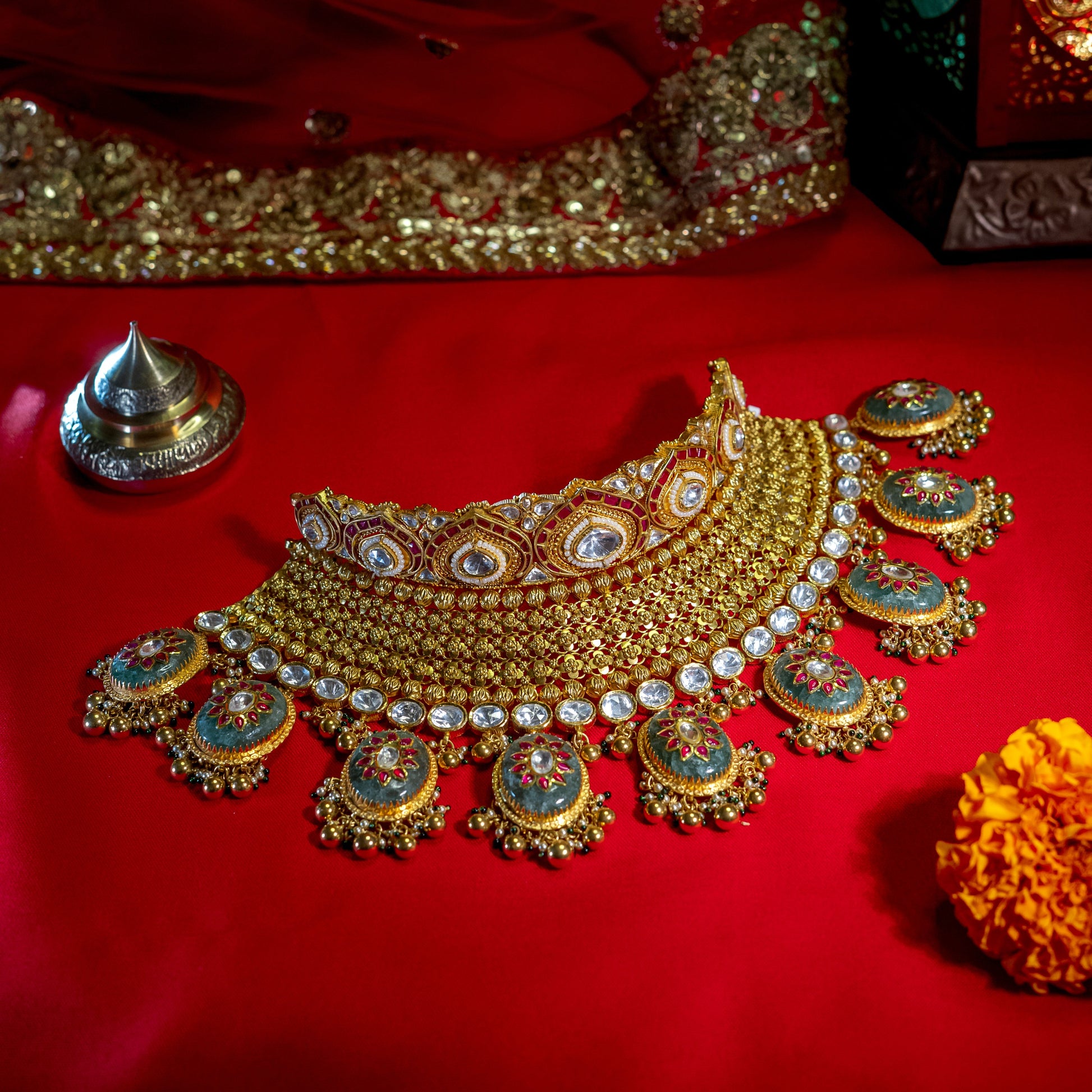 An Antique 22Karat Gold Rajwadi chokar with handwork Nakshi,adorned with russian emeralds studded with pure gold carving ,kundan,mozonite stones,fine gold balls,khaka moti and fine emeralds moti.