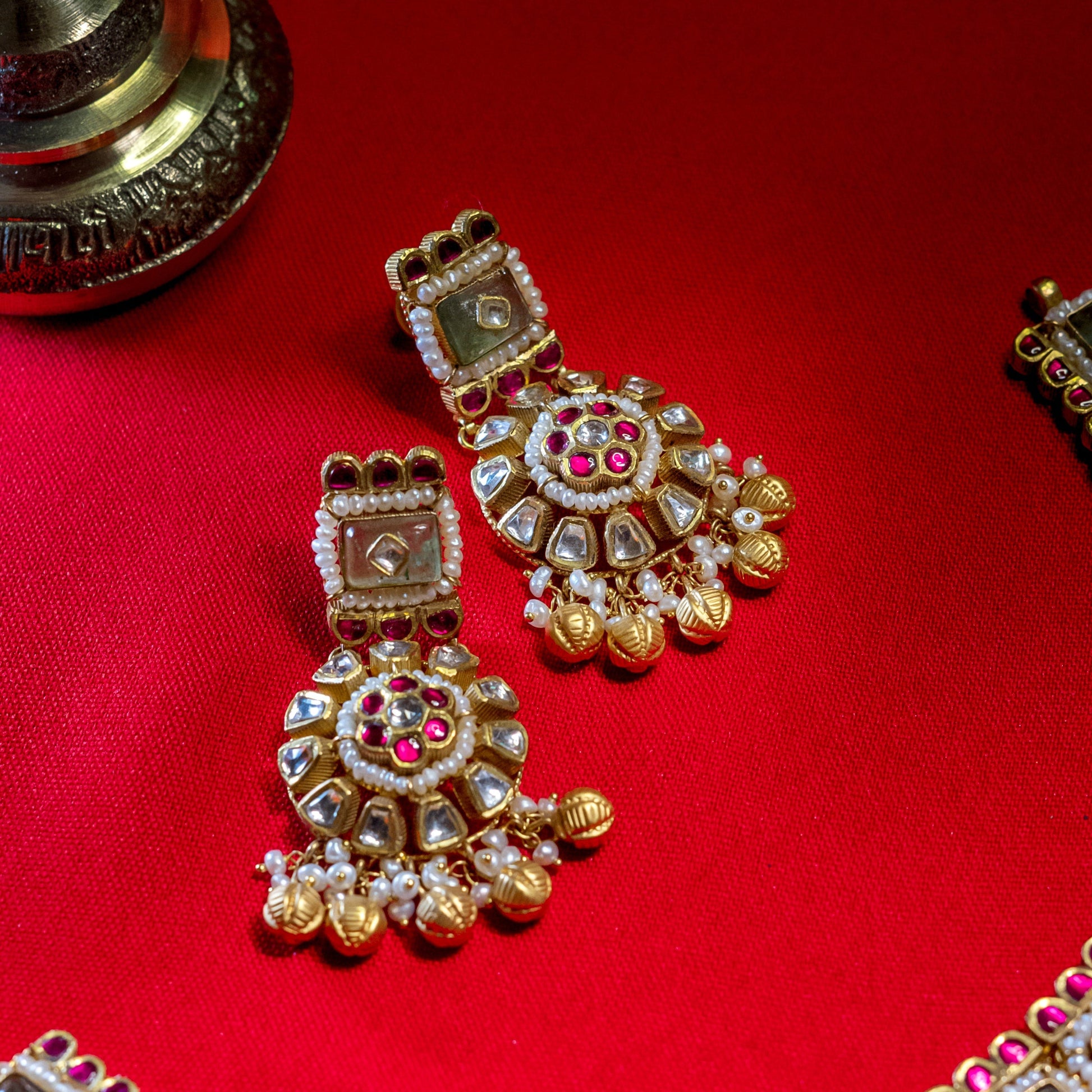 An Antique 22Karat Gold antique earings with royal craftmanship ,with jadau russian emeralds stone studded with pure cold carving ,adorned with kundan,mozonite stones,nakshi gold balls and khaka moti for timeless elegance.