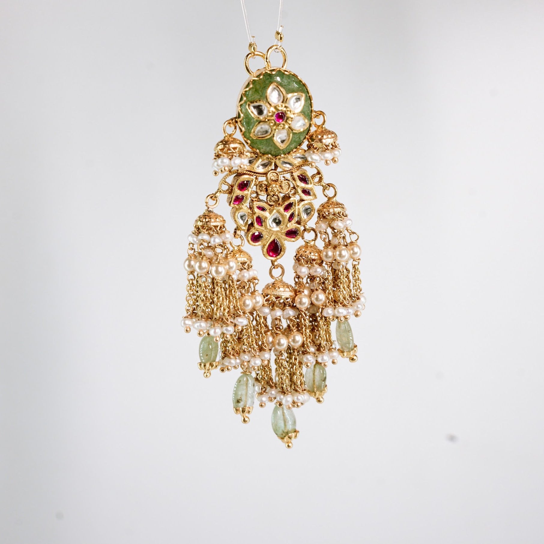 Exquisite 22K gold antique earrings with jadau emeralds with pure gold carving, adorned with kundan long gold chain hangings accented by Russian emerald moti and khaka moti for a regal heritage allure.