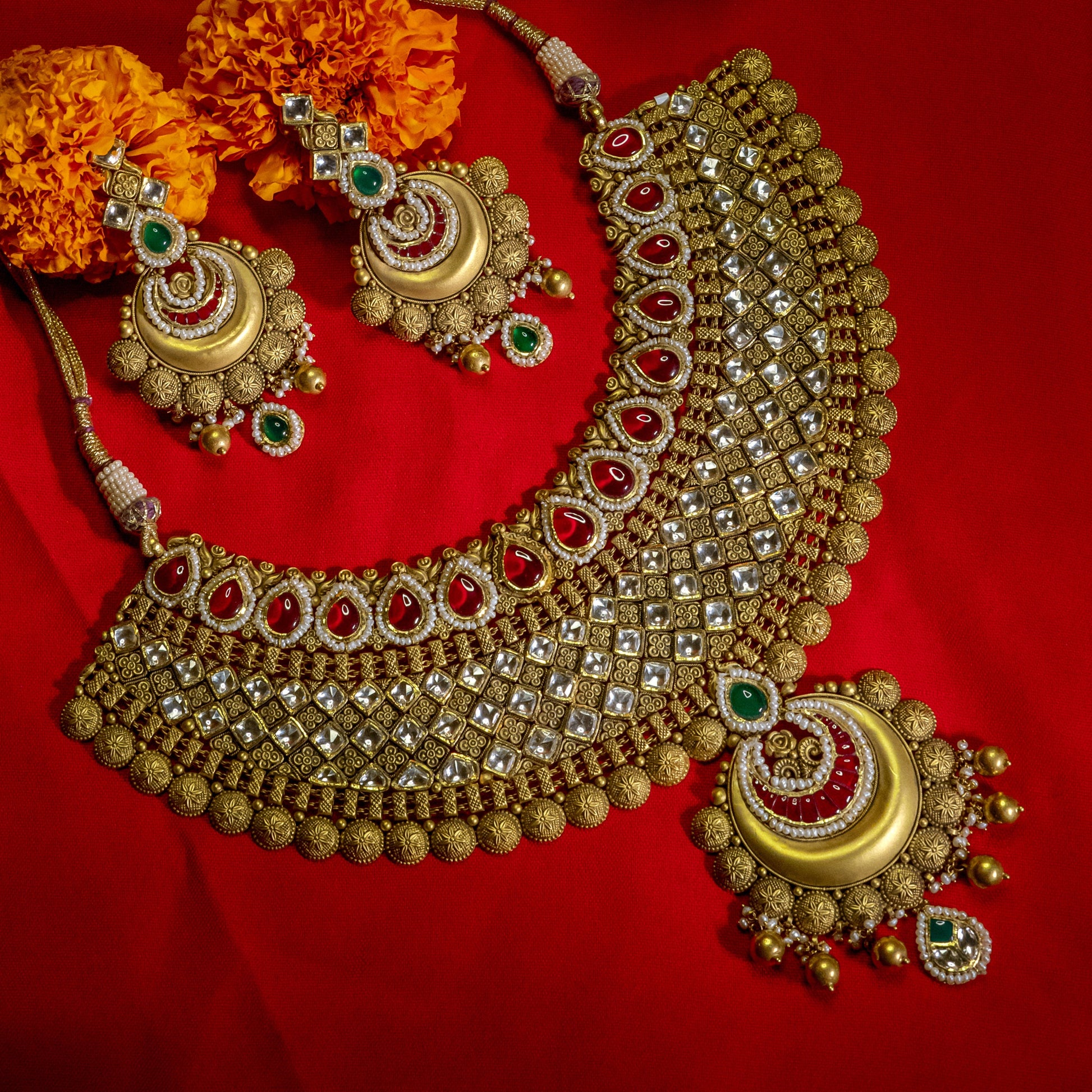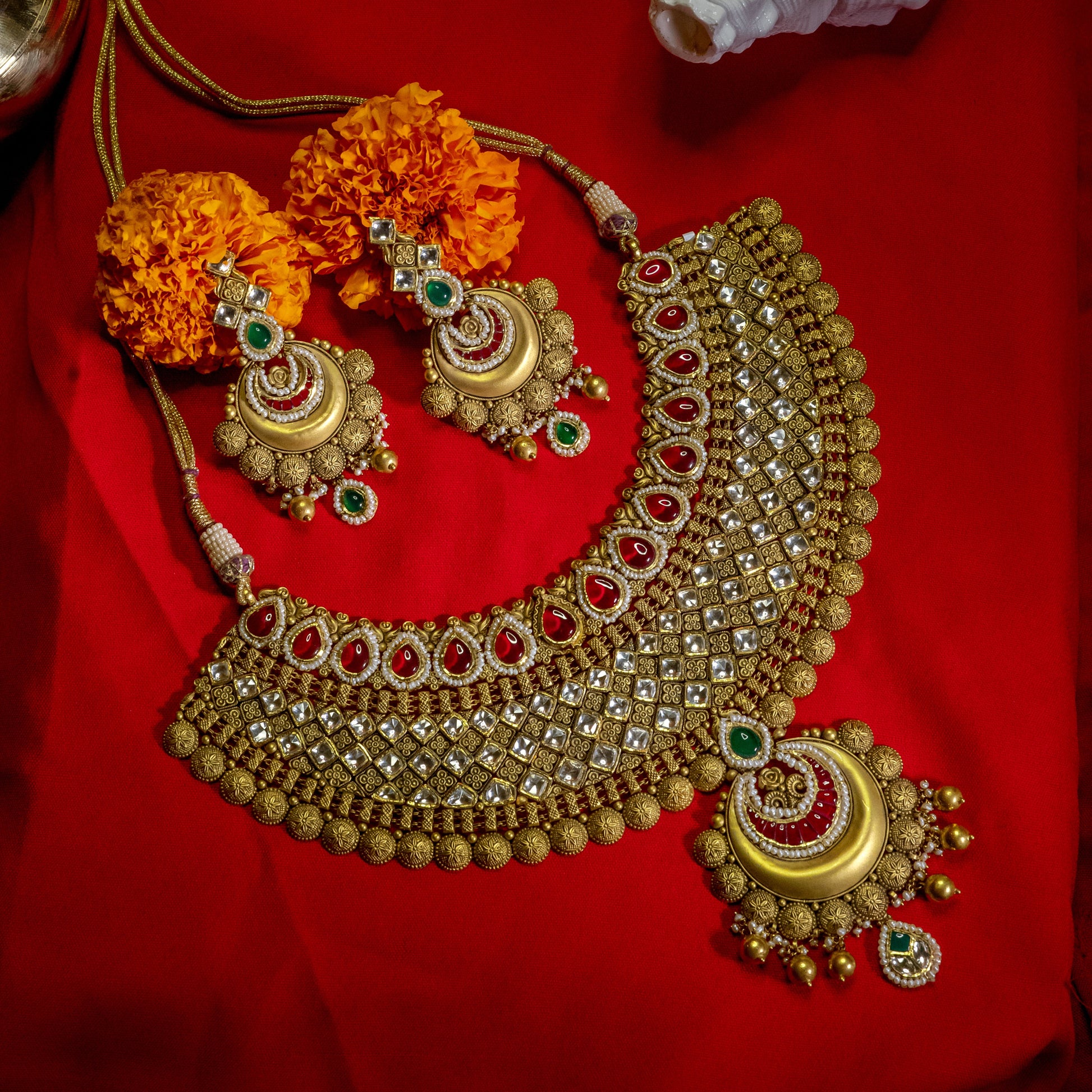 An Antique 22Karat Gold antique earings with Nakshi craftmanship , with chand drop in centre,adorned with kundan,mozonite stones,shiny gold balls and khaka moti.