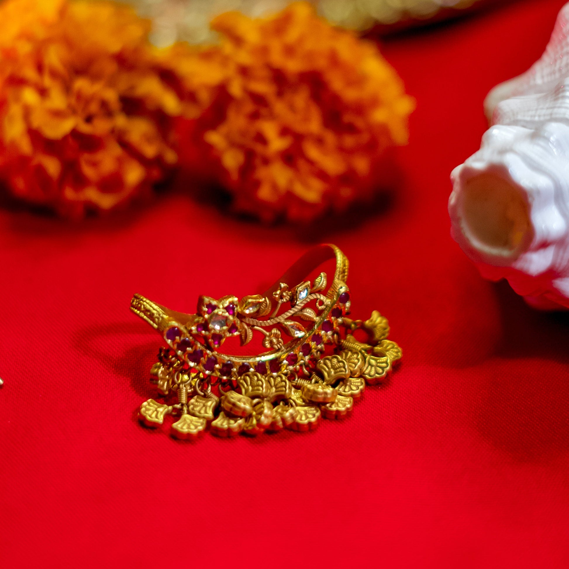 A 22Karat Gold Rajwadi finger ring with, gold flowers figures, gold nakshi balls hanging, studded with rubies,and natural polki for a timeless royal elegance.