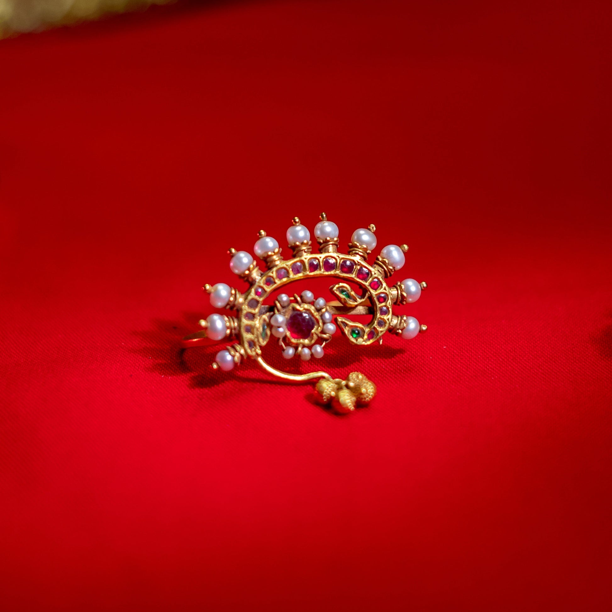 A 22Karat Gold Rajwadi adjustable ring with gold peacock figure,hanging of gold naksi balls, studded with rubies,emeralds, real khaka moti and natural basra moti for a timeless royal elegance.