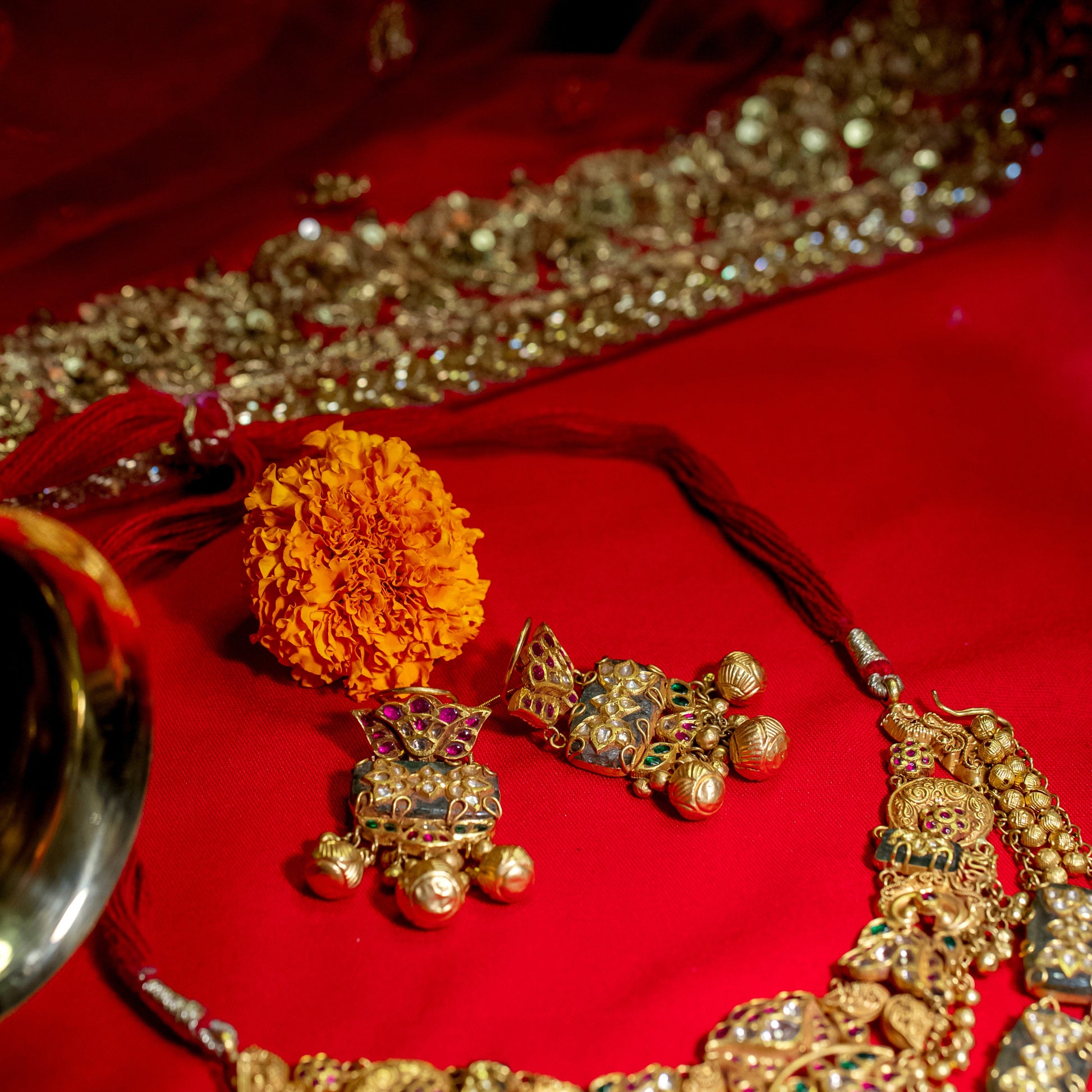 A 22Karat Gold Heritage Rajwadi earings ,with handwork naksi craftmanship, adorned with Jadau emerald stone with pure gold carving, rubies , emeralds and natural polki for a timeless royal elegance.